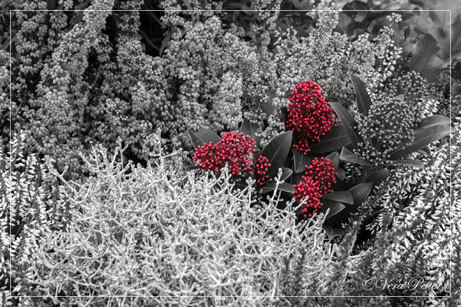 Heute gibt es ein Bild mit der typischen Winterbepflanzung, nichts Besonderes, aber ein wenig provozierende Farbkontraste vor der Haustür.