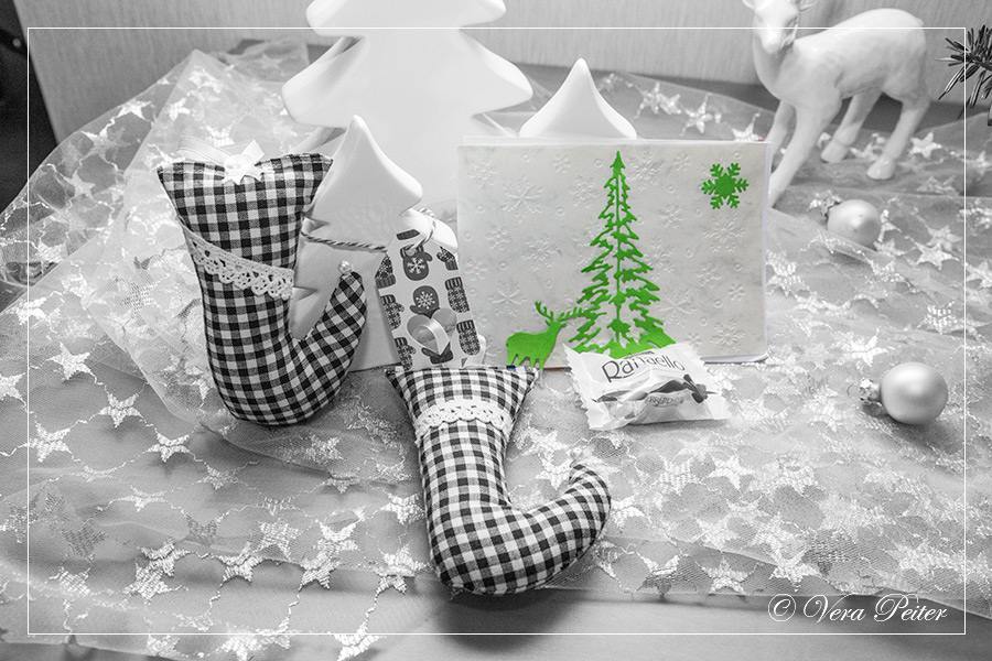Am Freitag kam hier ein echter Überraschungsbrief von der lieben Christine an. Sie hat zwei ganz wunderbare Elfenschuhe genäht und eine sehr weihnachtliche Karte geplottert. Das Pralinchen existiert nun nicht mehr, war aber sehr lecker :))