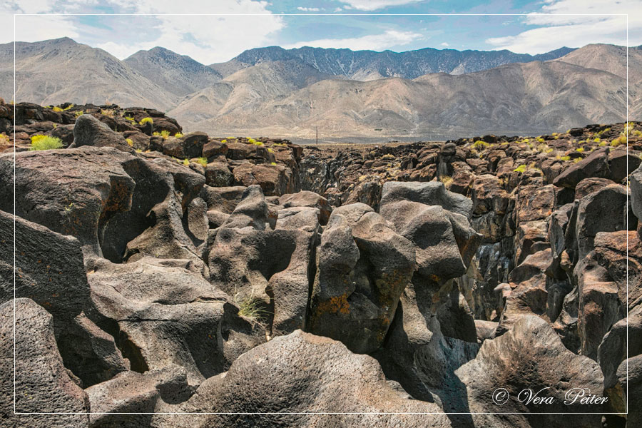 F wie Fossil Falls. Bei diesem Gestein handelt es sich um Basalt, es ist also vulkanischen Ursprungs. Entsprechend geformt und auch poliert wurden die Steine durch einen Fluss, der früher dort Verwirbelungen gebildet hat.